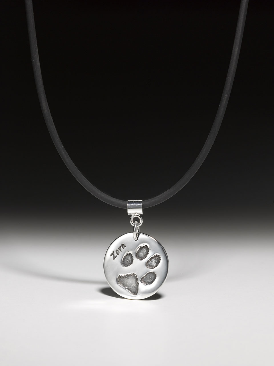 Pfötchenabdruckanhänger und Adapter an einem Kautschukcollier mit Gravur, Durchmesser 2,5 cm. Für diesen Anhänger können Sie auch eine Silberkette auswählen.