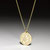 Runder Pfotenabdruckanhänger an einer vergoldeten Silberkette. 2,2 cm im Durchmesser. Der Anhänger wird mit einer sehr haltbaren Vergoldung versehen. Optional mit einer Gravur auf der Vorderseite- und / oder Rückseite.